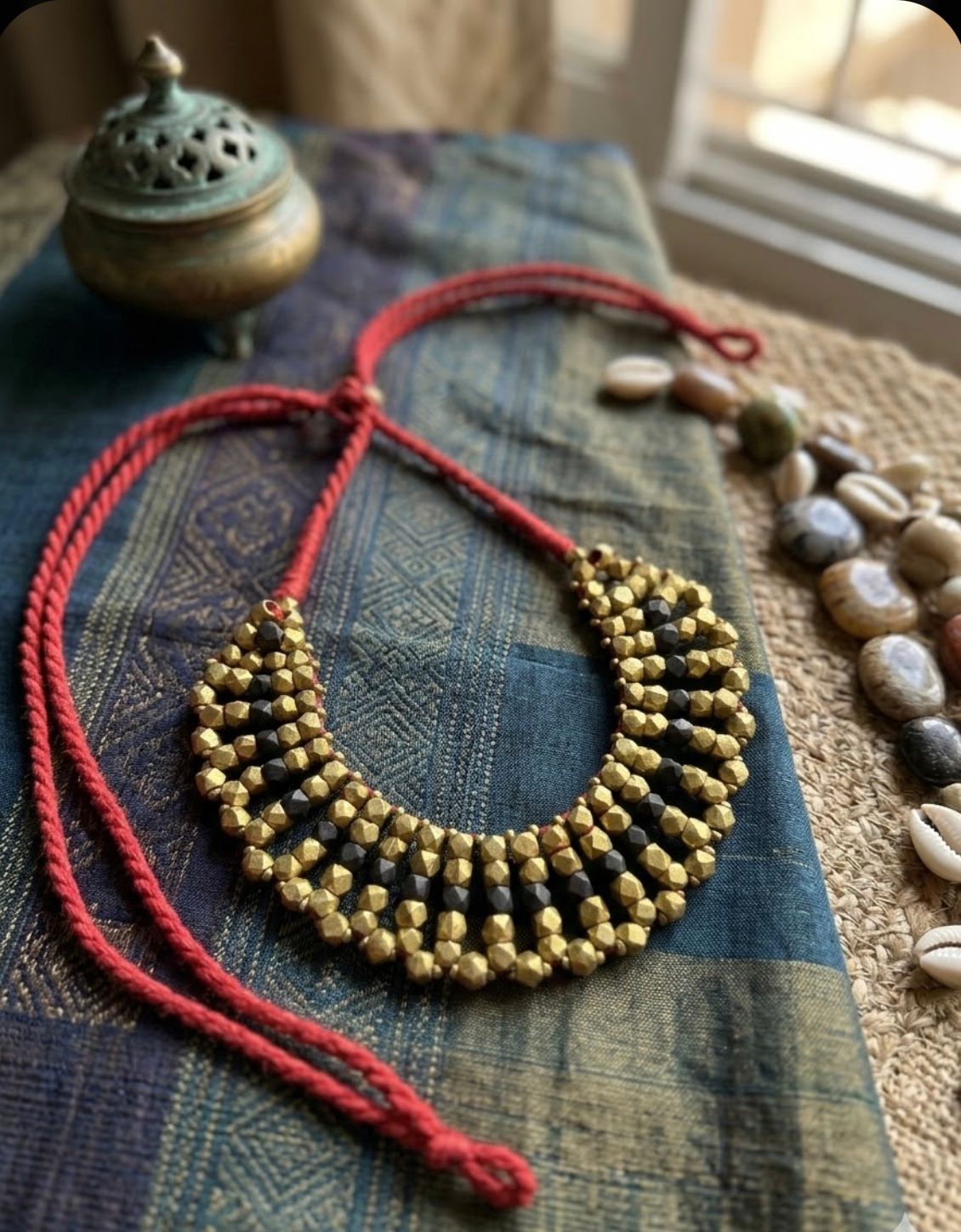 Rooted in ancient artistry, this Dhokra choker is a stunning expression of tribal heritage and timeless design. Handcrafted using the traditional lost-wax casting technique, each piece carries a raw, rustic charm that makes it truly one of a kind.