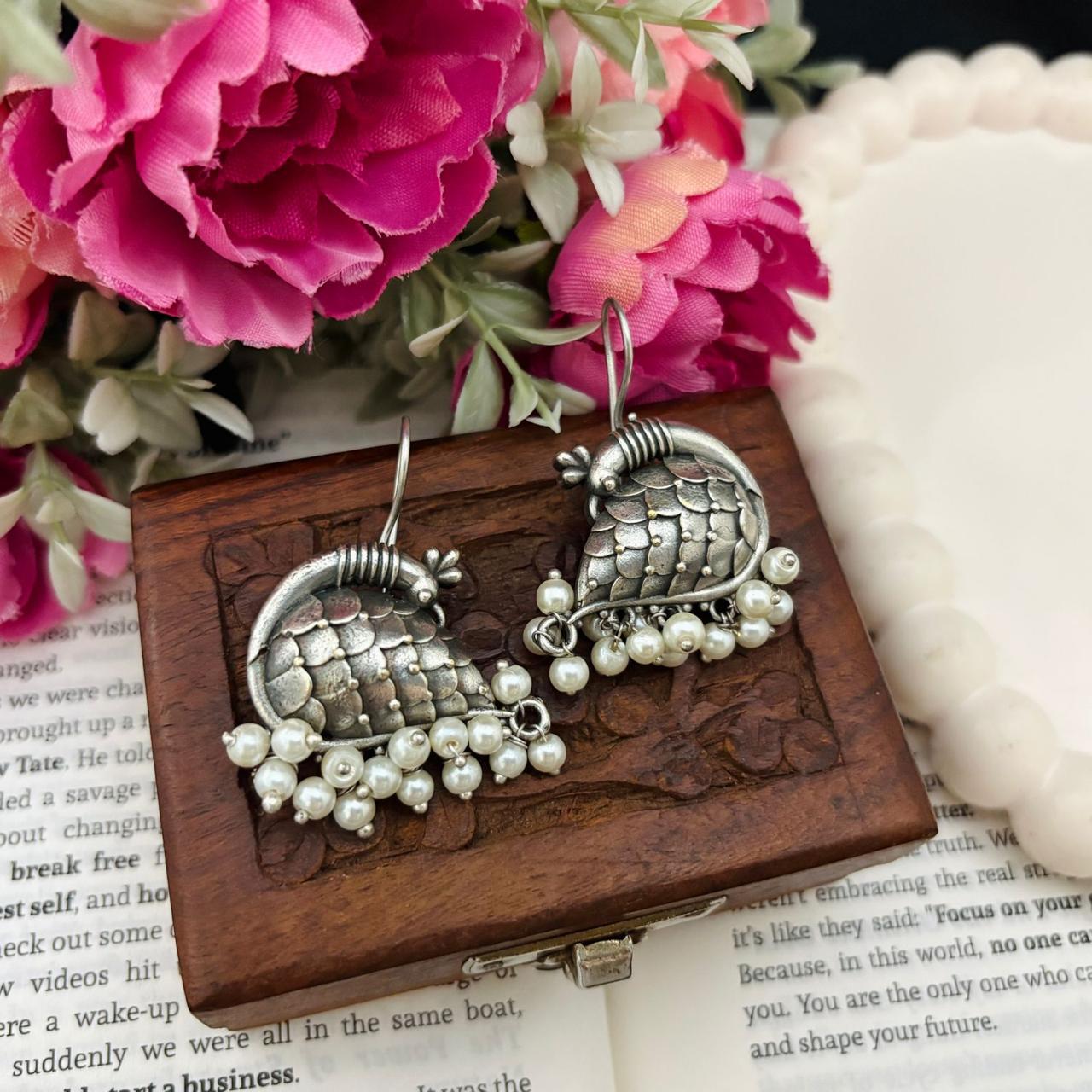 Add a royal touch to your look with these stunning German silver peacock danglers, inspired by the beauty and grace of the peacock. Featuring intricate detailing and a rich oxidised finish, these earrings reflect traditional artistry with a timeless appeal.