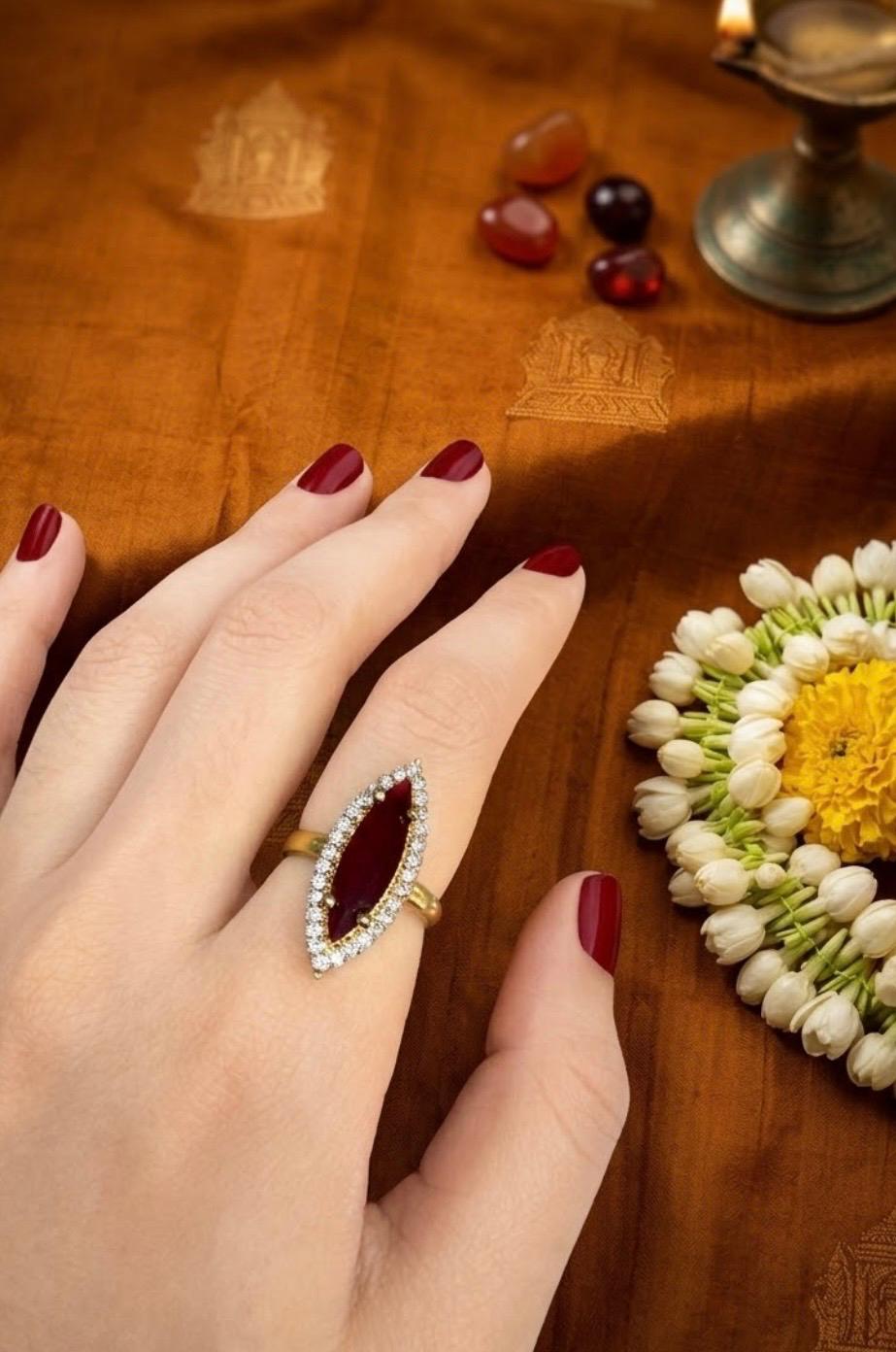 Make a bold and elegant statement with this stunning gold finger ring, featuring a rich red stone at its center. The deep, vibrant hue of the stone beautifully complements the warm gold finish, creating a look that is both timeless and eye-catching.