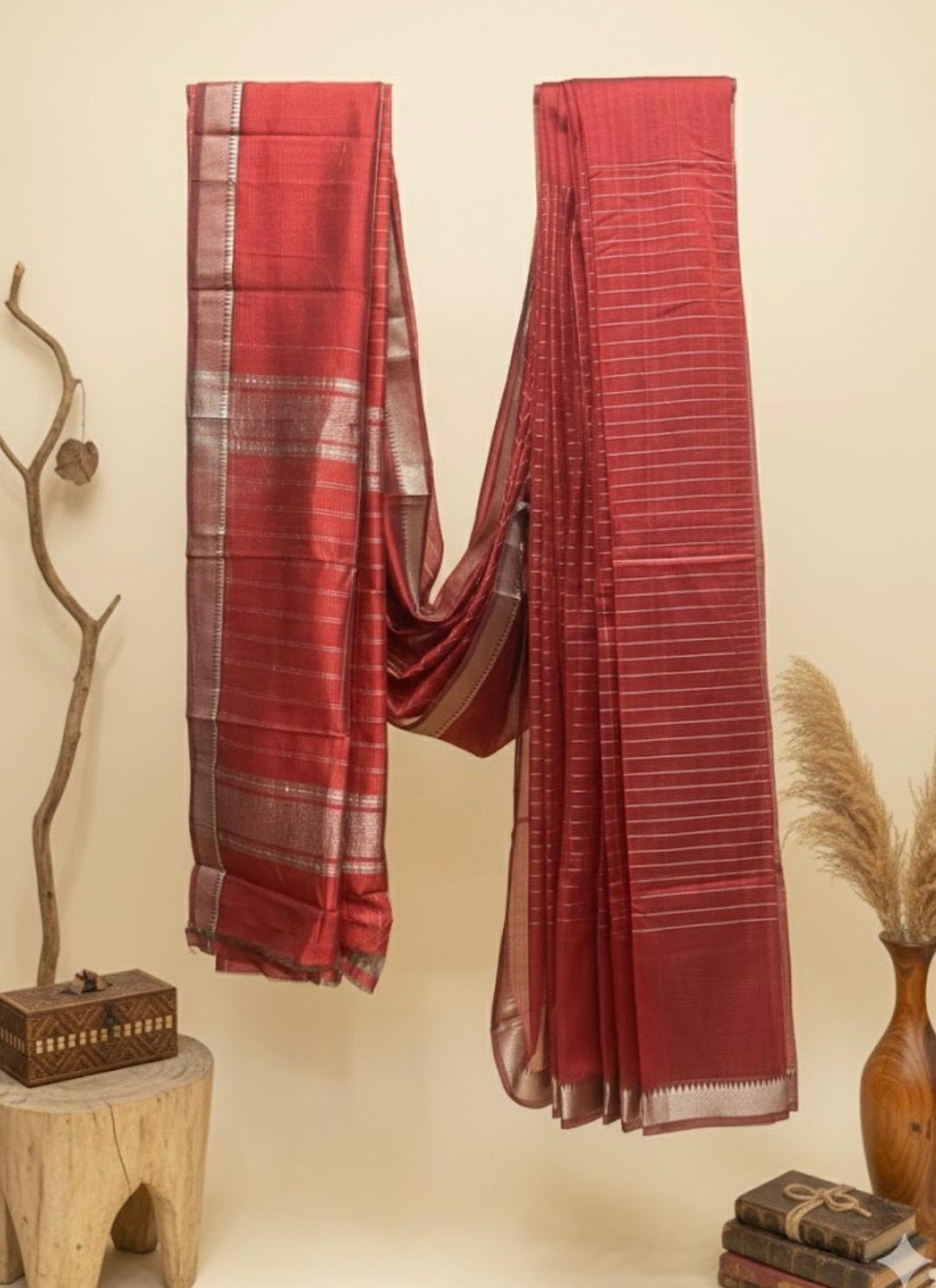 Woven in Mangalagiri’s ancient tradition, this red check saree is a study in quiet confidence. Crafted on handlooms along the banks of the Krishna river, its signature fine weave and distinctive check pattern carry the unmistakable texture of genuine cotton — light, breathable, and effortlessly dignified. The deep red grounds the geometric check with warmth, making it as fitting for a working day as it is for a festive one.