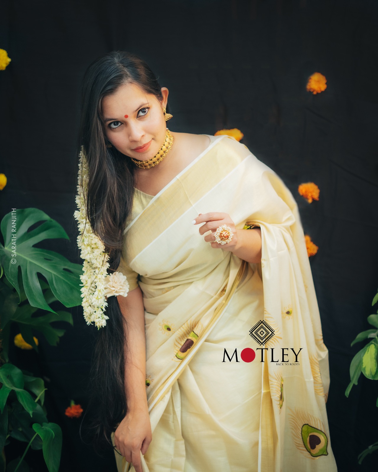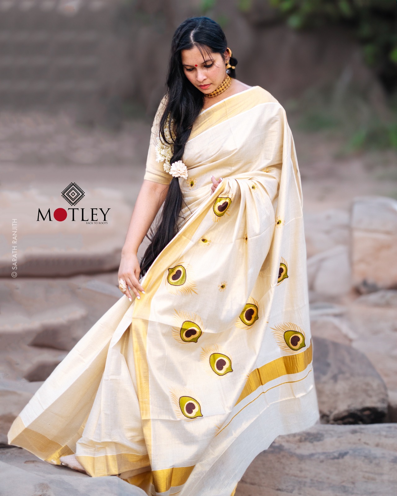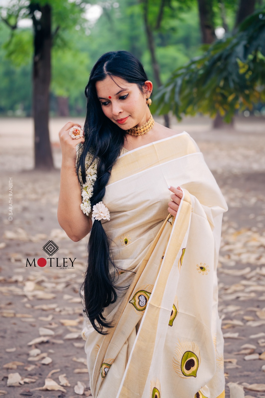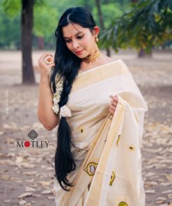Unfold the elegance of the Festive season with the vibrant hues of Kerala Kasavu saree adorned with delicate Green and Gold thread work make heads turn with your traditional yet chic fashion statement!
