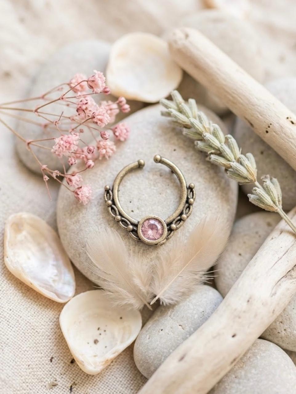 Add a touch of subtle sweetness to your look with this delicate septum nosepin featuring a soft baby pink-colored stone. The gentle pastel hue gives a dreamy, feminine vibe—perfect for those who love minimal yet elegant jewellery.