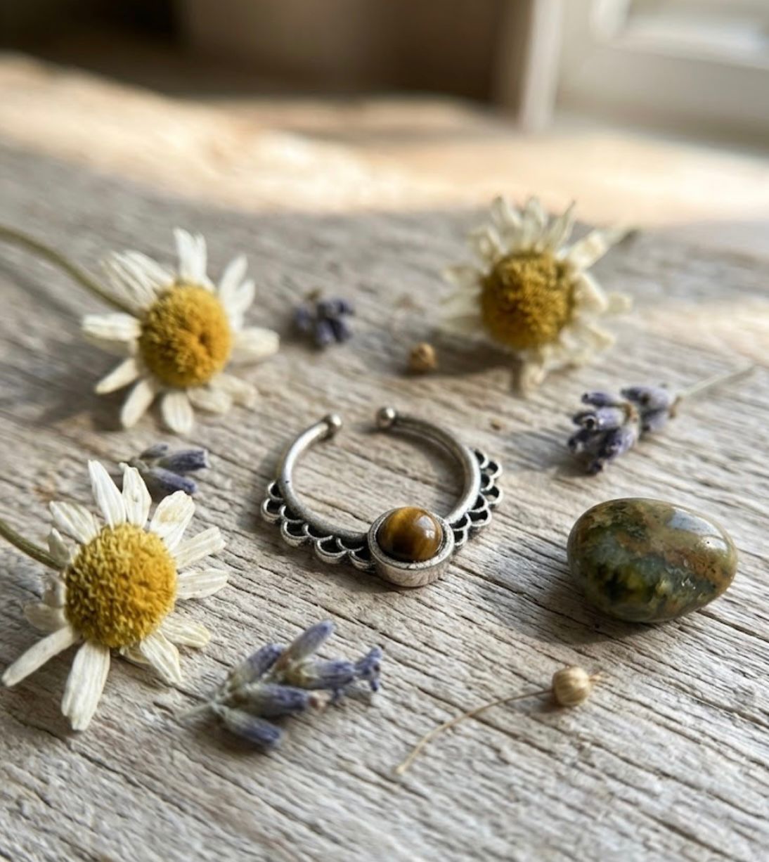 Add a touch of earthy elegance to your look with this stunning septum nosepin featuring a rich golden brown stone. The warm, muted tone gives a perfect balance of subtle shine and natural charm, making it a timeless addition to your jewellery collection.
