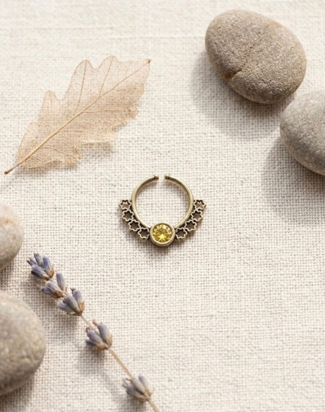 Brighten up your look with this charming septum nosepin featuring a vibrant yellow-colored stone. The warm, sunny hue adds a fresh and lively touch, making it perfect for those who love subtle yet cheerful accessories.
